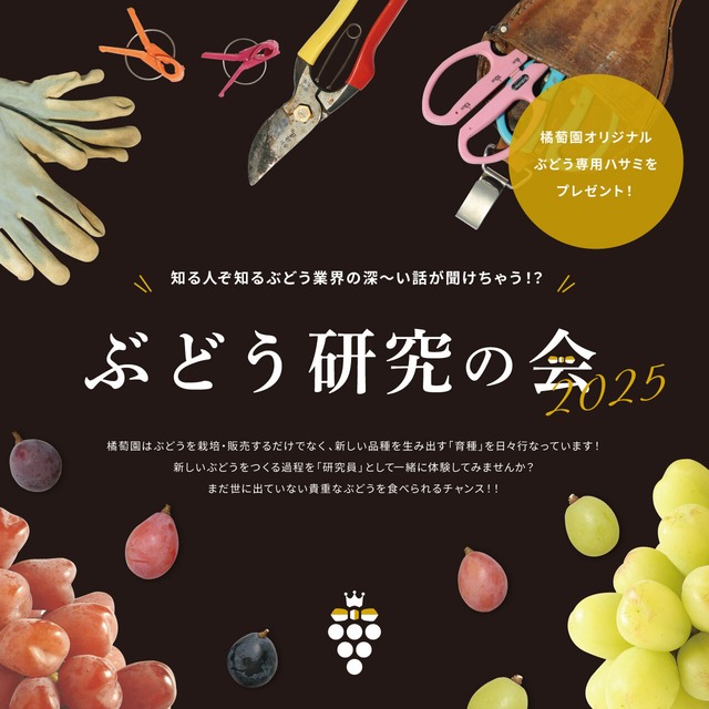 【8/1~販売開始】 知る人ぞ知るぶどう業界の深〜い話が聞けちゃう!? ぶどう研究の会2025は、新しいぶどうをつくる過程を「研究員」として一緒に体験する会です。 橘萄園では、ぶどうを栽培・販売するだけでなく、新しい品種を生み出す「育種」を日々行なっています! まだ世に出ていない貴重なぶどうを食べられるチャンス!! あなたの選んだぶどうが、未来の橘萄園のリーフレットに載るブドウになるかも? 〈橘萄園ぶどう研究の会2025〉 ・場所:橘萄園直売所 ・日時:8/30(土)15:00- ・定員:先着20名 ・参加費:5,000円 [参加特典] ・01.ぶどう先行試食会 研究途中のぶどうを含め、様々な品種を 食べ比べて感想を聞かせてください! あなたの意見が今後反映されるかも!? ・02.ノベルティプレゼント 橘萄園のロゴが入った、ぶどうを 切るための専用ハサミをプレゼント! ぶどうマニアのためにご用意しました!